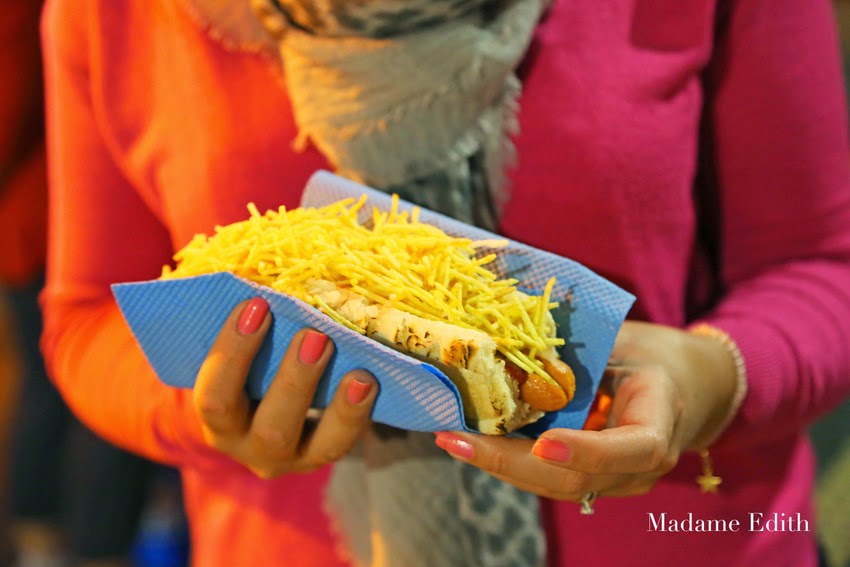 Po pierwsze: bardzo dobra kiełbaska, przypominająca niemieckie „wursty”. Jako dodatki używane są tu zielone oliwki, cebulka, pyszne sosy, musztarda, a nia wierzchu kanapka posypywana jest mini frytkami. Nie chcę wiedzieć ile coś takiego ma kalorii, ale powiem Wam jedno: to był najlpszy hot dog, jaki jadłam w życiu. Przebił nawet wiedeńskie kiełbaski, którymi zachwycałam się rok temu w Wiedniu.