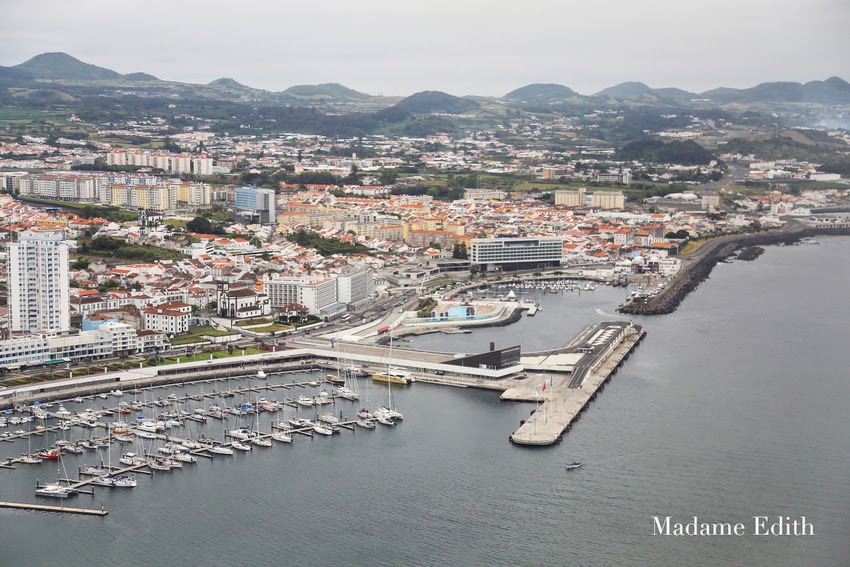 Ale zacznijmy do początku. Lądowanie na São Miguel gwarantuje niezapomniane widoki na stolicę. Na powyższym zdjęciu widać nawet nasz hotel umieszczony nieco w lewo od centrum kadru. Podziwiać można marinę i Portas do Mar, czyli wybudowane niedawno pirsy, w których umieszczono centrum nocnego miejskiego życia (niezliczoną liczbę restauracji, sklepów i barów).