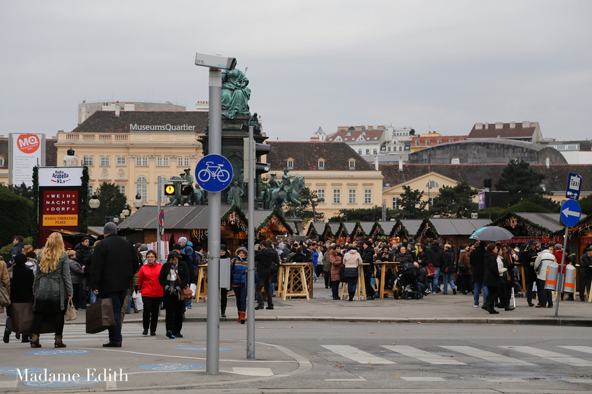 Tylko kilka kroków dalej leży wioska świąteczna na placu Marii Teresy pomiędzy dwoma bliźniaczymi muzeami – Historii Sztuki i Historii Naturalnej. Tu w czasie Adwentu usatawianych jest tu ponad 70 stoisk, które oferują tradycyjne wyroby rękodzielnicze i oryginalne pomysły na prezenty.