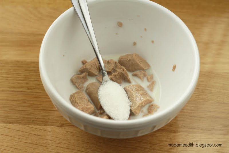 W miseczce rozkruszone drożdże zalewamy kilkoma łyżkami mleka. Dodajemy cukier, łyżeczkę mąki i dobrze mieszamy.