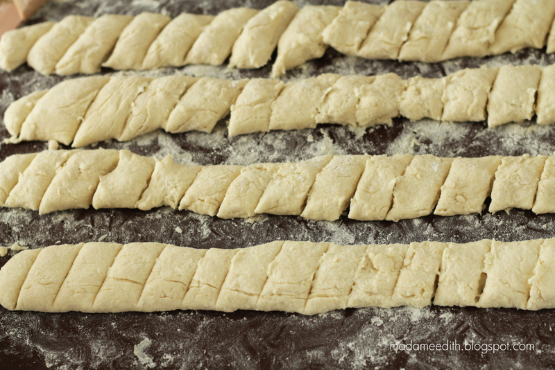 Z ciasta formujemy wałki o średnicy ok. 4 cm, spłaszczamy je i ostrym nożem kroimy na ukośnie kluski.