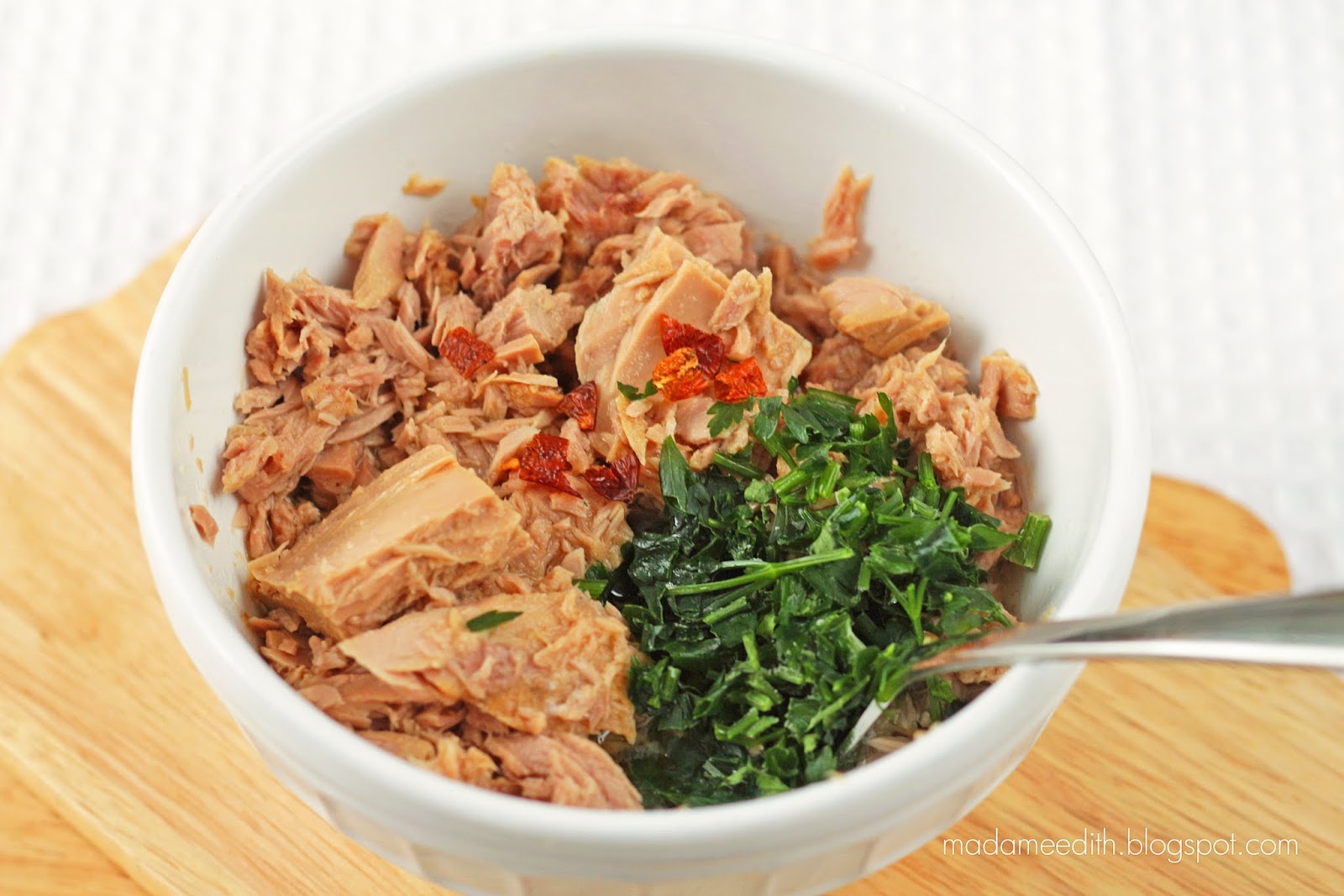 W miseczce mieszamy tuńczyka z posiekaną papryczką i oliwą oraz ewentualnie natką pietruszki.