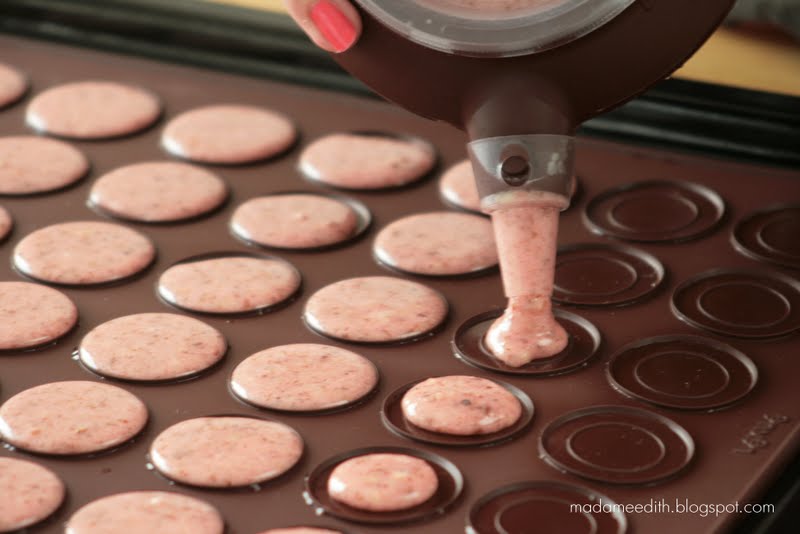 Tym razem na szczęście było inaczej, bo z pomocą przyszła Fabryka Form z propozycją wypróbowania zestawu do makaronów. Zestaw ten okazał się bardzo pomocny, szczególnie silikonowa mata, dzięki której można zrobić beziki, o równym kształcie. Poniższy przepis pochodzi z książeczki dołączonej do zestawu, ale jest bardzo podobny do przepisu podstawowego załączonego w książce „Macarons” (minimalne różnice w proporcjach).