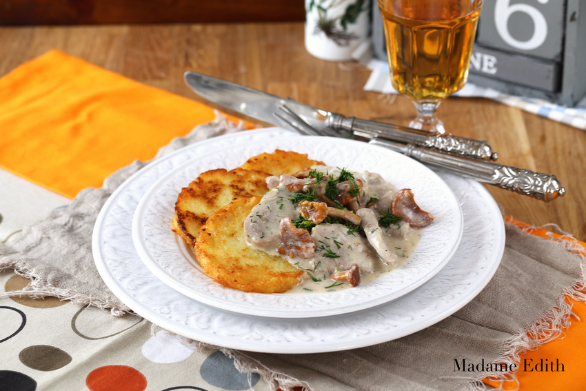 Wspaniały obiad! Uwielbiam kurki, a w towarzystwie polędwiczek i placków musiały smakować wyśmienicie.