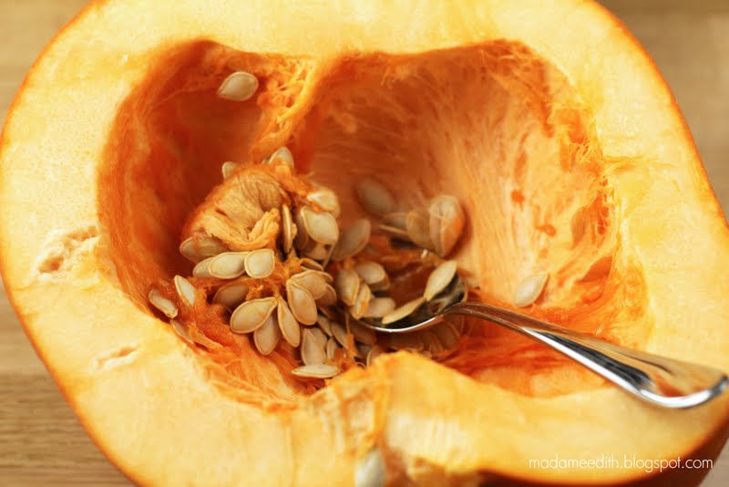 Dynię kroję na pół. Wybieram pestki.