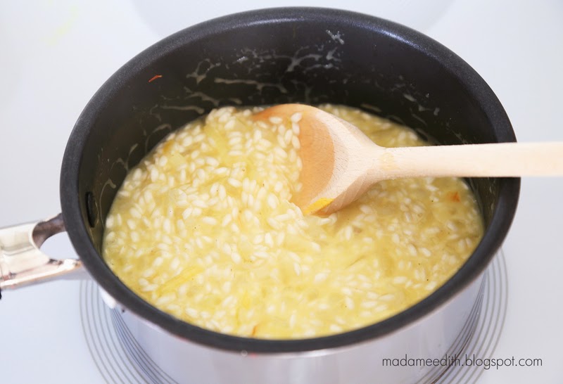 * W zależności od rodzaju ryżu ilość bulionu może być nieco większa lub mniejsza. Podczas gotowania trzeba sprawdzać ryż, by miał odpowiednią, nieco lejącą konsystencję i był ugotowany al dente, gdyż po odstawieniu na 2 minuty „dojdzie”. Dlatego też nie można wlewać całego bulionu na raz, a trzeba go co chwila dolewać, by każda nowa porcja wlana do garnka została wchłonięta przez ryż.