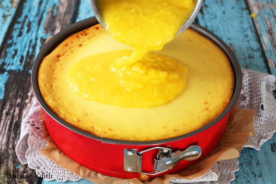 Kiedy mus z mango nieco ostygnie przekładamy go na ostudzony sernik.