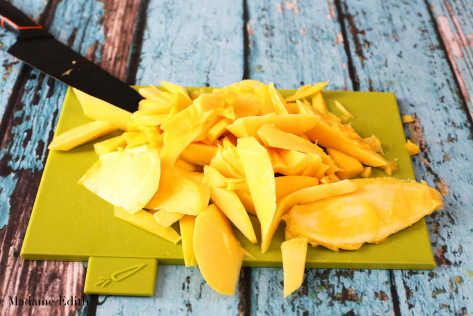 Gdy sernik się studzi obieramy mango i kroimy na mniejsze kawałki.
