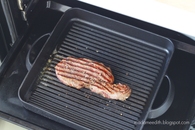 Nagrzewamy patelnię grillową (używam żeliwnej). Kładziemy steka i smażymy go 3 minuty (jeśli Wasz stek jest cieńszy, wystarczy smażyć go 2 minuty)