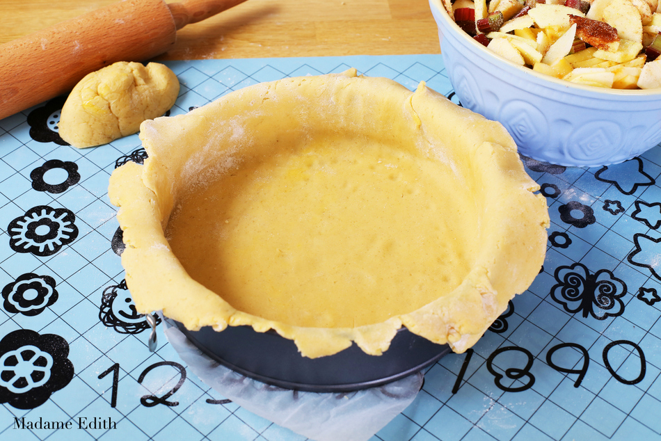 Resztę rozwałkowujemy na grubość ok. 5 mm i wykładamy do formy wyłożonej papierem do pieczenia i posmarowanej masłem. Ciasto dociskamy do blachy.