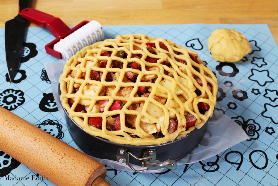 Szarlotka z rabarbarem to spełnienie snów o wypieku idealnym: z małą ilością kruchego, doskonałego ciasta i ogromną pysznych jabłek oraz świeżego rabarbaru. Nieco zmieniłam recepturę na kruche ciasto i dodałam odrobinę śmietany, którą bardzo lubię za to, że już niewielka jej ilość niesamowicie wpływa na smak, jak i strukturę. Do tego obowiązkowo wysoka forma jak w amerykańskich filmach i elegancka kratka. Przepis jest nieco pracochłonny, ale zdecydowanie palce lizać!