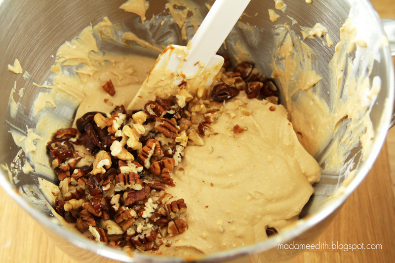 Następnie pomału dodajemy masę kajmakową. Mieszamy. Na samym końcu wrzucamy posiekane daktyle i orzechy.