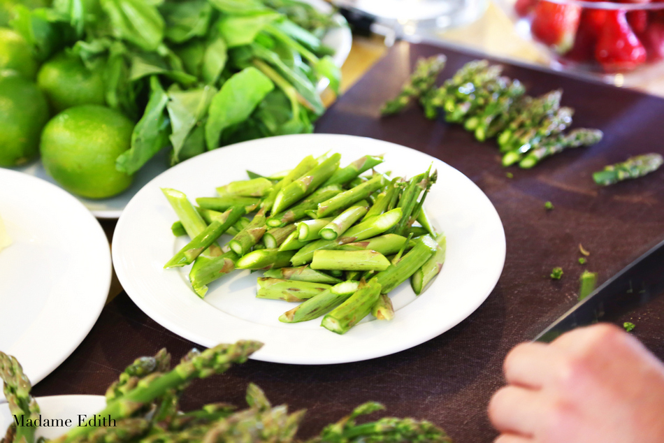 Szparagi dokładnie myjemy i odłamujemy twarde końce. Kroimy po skosie na 3-4 cm kawałki – takie, by zmieściły się na łyżce. Główki odkładamy na bok.
