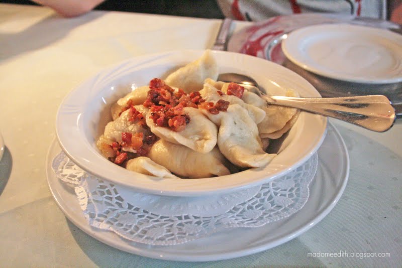 Tu zaczęliśmy od 2 zup – rosołu z kołdunami oraz zabielany barszcz z botwinki z gotowanymi ziemniakami. Szczególnie tę drugą zupę mogę polecić, bo była bardzo smaczna, a i porcja solidna (za 14 zł). Na drugie postanowiliśmy zamówić michę pierogów (około 30 zł). Ledwo daliśmy radę ją zjeść we dwójkę, bo już sama zupa była sycącą zważywszy, że na początku na przegryzkę dostaje się chleb ze smalcem.