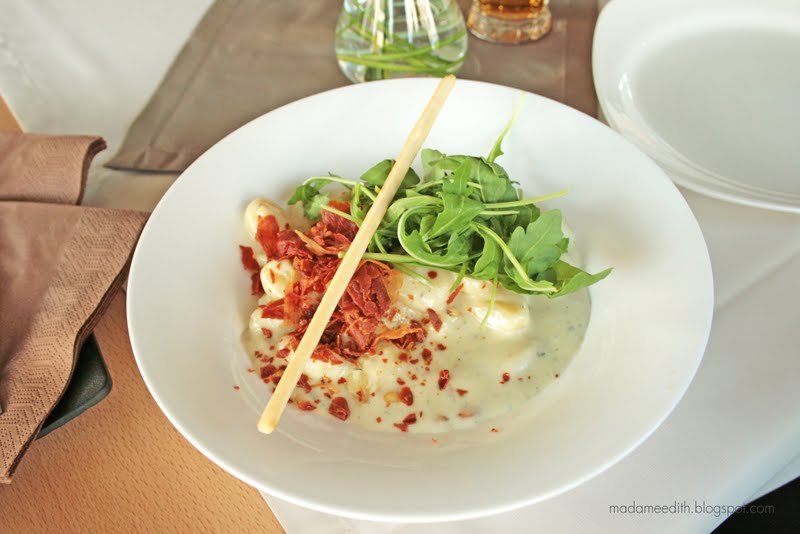 Ceny są tu na podobnym poziomie do tych w Bernardzie (za 2 dania obiadowe, zestaw 3 mini deserów zapłaciliśmy i napoje ok. 120 zł). Potrawy były bardzo smaczne i ślicznie się prezentowały na talerzach – jedliśmy sałatkę z kurczakiem z sosem musztardowym oraz gnocchi z szynką parmeńską i gorgonzolą.