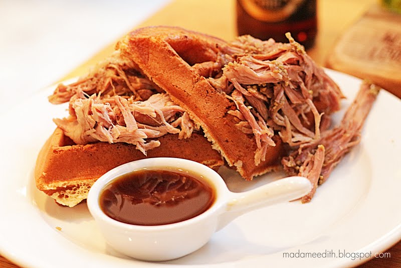 Z nieskrywaną ciekawością zamawiam gofry z mięsem (soczystą łopatką) podane w z miseczką syropu klonowego (18,50 zł). Może połączenie smakowe wyda Wam się dziwne, ale zapewniam Was, że jest gofry smakują obłędnie! To jeden z tych smaków, po który będę tu wracać. Mięso jest delikatne, soczyste, rozpływa się w ustach.