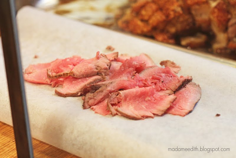 Na drugi ogień idzie kanapka z rostbefem za 17,50 zł. Jest serwowana z majonezowym sosem z zielonym pieprzem, na świeżej bagietce i z mięsem pieczonym przez 15 minut. Kanapce towarzyszy mały słoiczek z ogórkami pociętymi w grube zapałki. Z tego, co widziałam inne kanapki podane są w ten sam sposób: na deseczce, z ogórkami 🙂